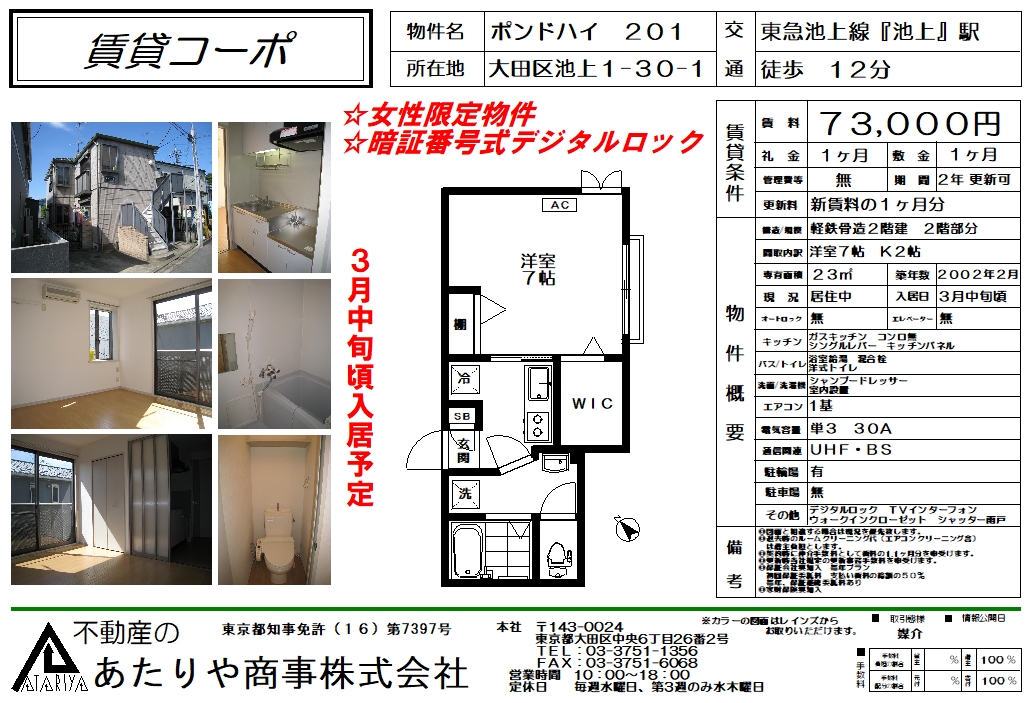2026-01-25 ● 賃貸コーポ 賃料:73.000円 間取:1K 所在地:大田区池上1丁目 交 通: 東急池上線 『池上駅』より徒歩12分 ★ 女性限定物件 ★ 暗証番号式デジタルロック ★ 3月中旬頃入居予定 ☆ マップ ☆ 外観